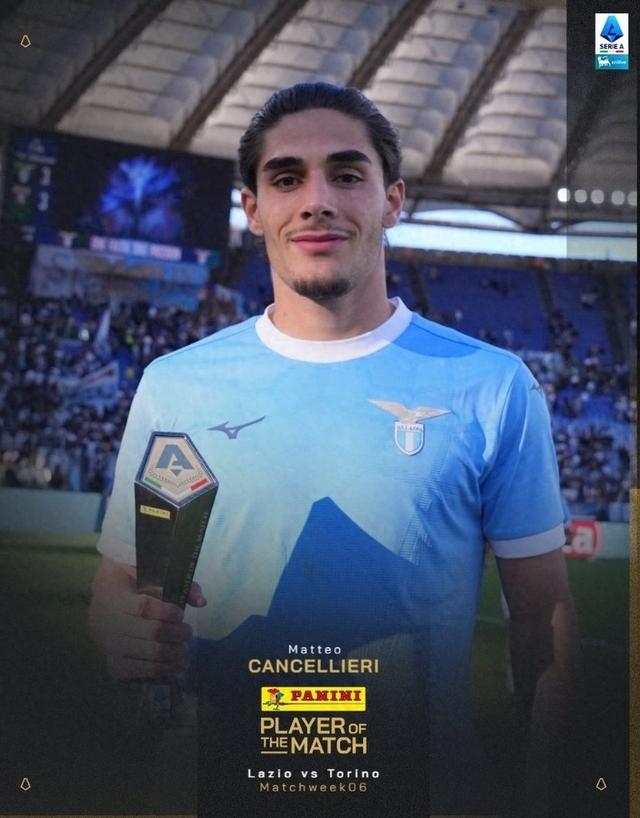 梅开二度,意甲官方:坎塞利耶里当选拉齐奥3-3都灵全场最佳2025-10-05