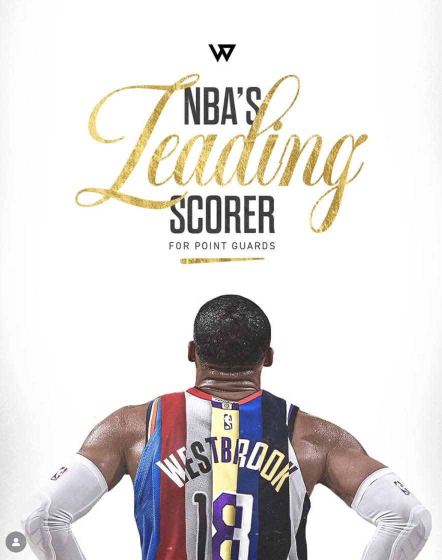 赛后,威少在ins晒出海报:正式加冕控卫历史得分王!